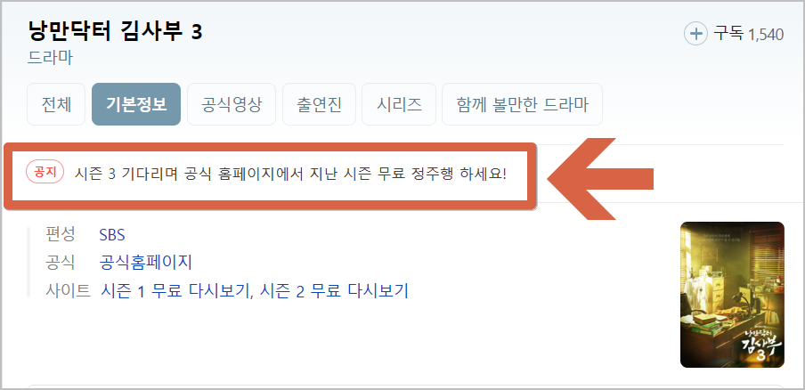 낭만닥터 김사부 공식 홈페이지에 반가운 소식이 있네요. 바로 무료 정주행 소식입니다. 혹시 전 시즌을 못 보셨다면 시즌 3가 방영되기 전에 무료로 정주행 하시길 추천드립니다.