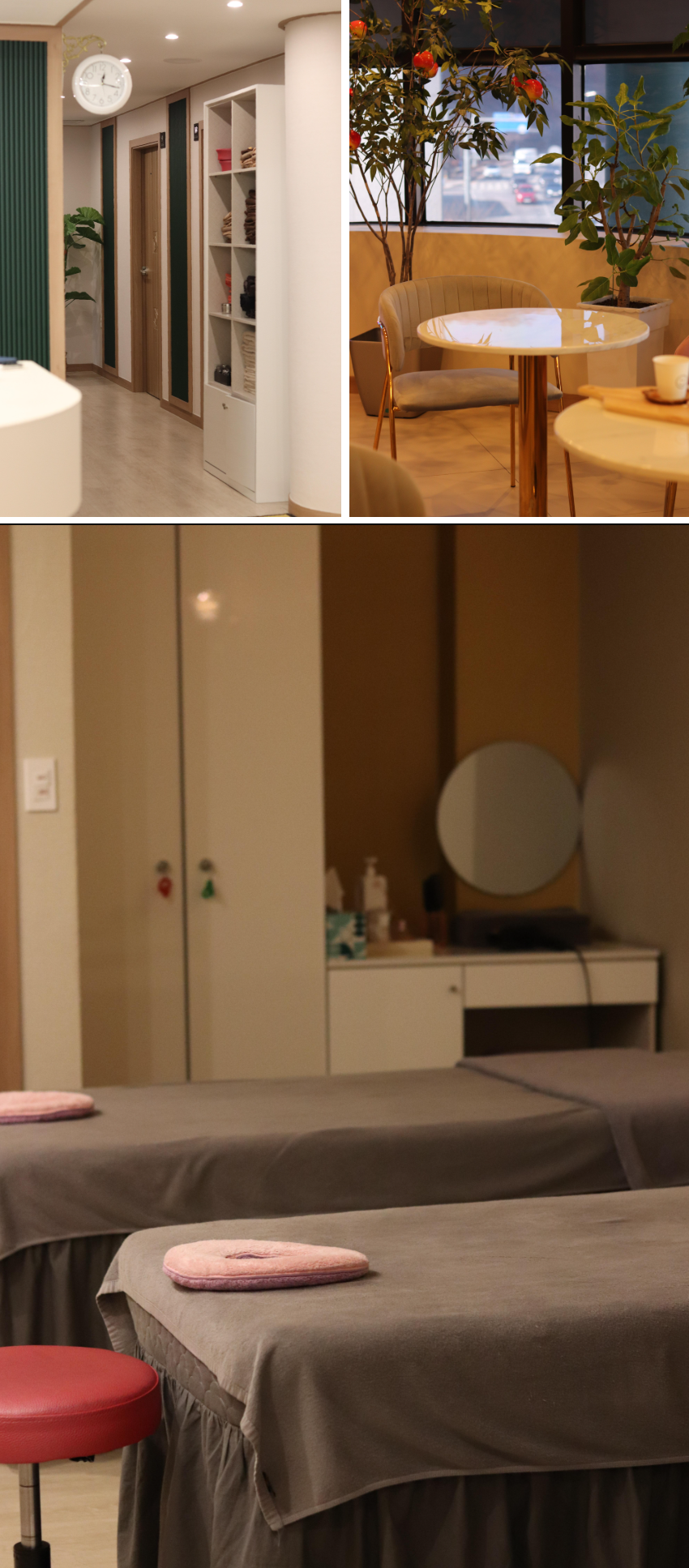 마사지샵에 들어서는 순간, 따뜻한 조명과 은은한 향기가 반겨줘서 기분이 정말 좋았어요. 전체적으로 차분하고 고급스러운 분위기라 마사지를 받기 전부터 힐링이 되는 느낌이었죠. 곳곳에 편안하게 쉴 수 있는 휴게 공간과 티 바도 마련되어 있어 마사지 전후로 따뜻한 차 한 잔을 즐길 수 있답니다.